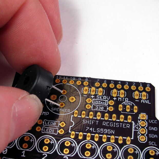 El altavoz es el siguiente. Hay dos juegos de agujeros. El altavoz vendido por SparkFun tiene conduce más cerca juntos, y tiene polaridad. El conjunto de orificios 90 grados fuera más lejos aparte y se colocan el altavoz de estilo PS1202 vendido por Adafruit, que no tiene polaridad.