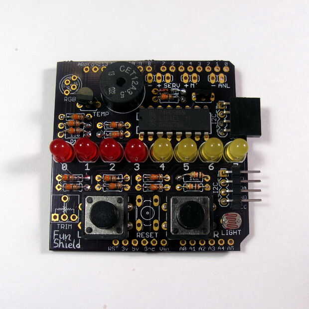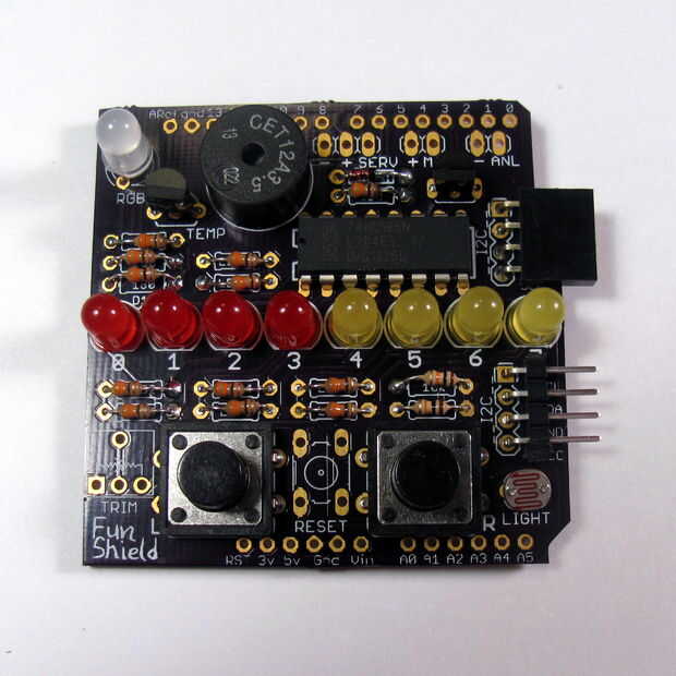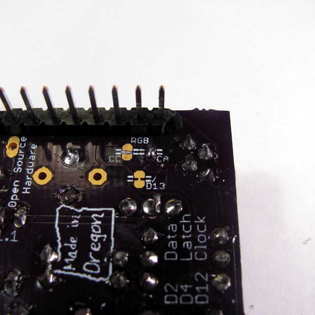 RGB led va en la esquina superior izquierda. Hay dos tipos de RGBs, cátodo común, donde el perno más largo tiene la tensión de alimentación, y cada color va a tierra y ánodo común, donde el pasador largo es el suelo. En ambos casos, el plomo más larga va a través del agujero con el botón cuadrado. La Junta viene lista para el cátodo común, que viene en kits de SparkFun, pero puede modificarse fácilmente para el otro si eso es lo que tienes de Adafruit. En la parte inferior de la tabla, cortar la almohadilla CC y el puente de soldadura de la almohadilla de CA. Compruebe que ambos continuidad con un multímetro. Nota: lo he dejado espacio suficiente para utilizar un 10mm RGB LED en lugar del estándar de 5 mm.