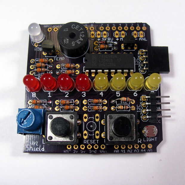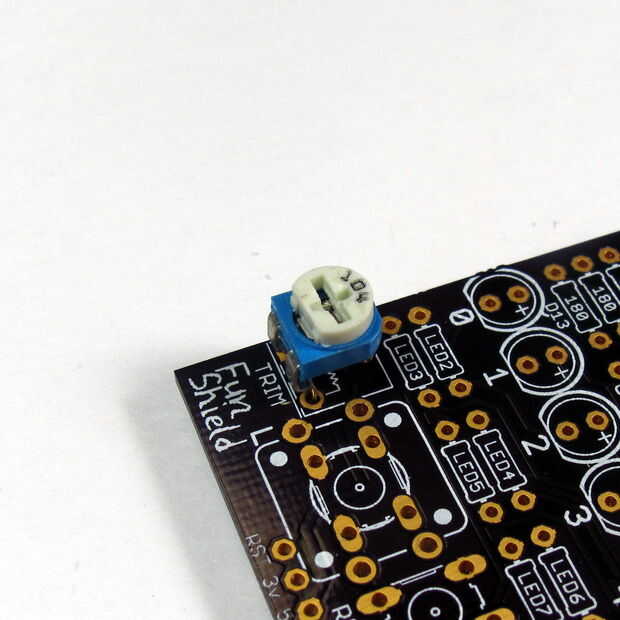 El potenciómetro, o "trim pot" va en la esquina inferior izquierda. Existen varios tipos de arreglos de pin potenciómetro, y el kit de SparkFun viene con una protoboard con tres cables de 0,1" espaciados en una línea. También he añadido el orificio compensado para montar las ollas de ajuste más común y baratas si es lo que tienes en mano.