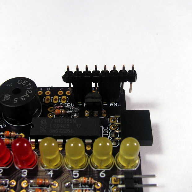 No había espacio para todos el SparkFun kits de componentes, así que añadido algunos encabezados para ayudarnos a conectar con el mundo exterior. La 2 mujer pines de la izquierda conecta el motor a la salida digital del transistor controlado. La cabecera hembra 2 pines a la derecha se conecta a un análogo pin y tierra para componentes como el sensor de flex. Utilice un pedazo de jefe varón para mantener alineados y ellos en su lugar mientras se suelda.