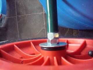 Golpee los ejes huecos a través de los agujeros en el barril y nivel de base hasta que estén precisamente ambos lados. La varilla roscada por el centro del hilo de rosca y rosca 2 tuercas, 1 rueda y 2 tuercas de ambos lados en ese orden. Añadimos una arandela en ambos lados también, pero no siempre es necesario. Asegúrese de que las ruedas son la forma correcta de circular (el thingie de inyector de aire va en el exterior).