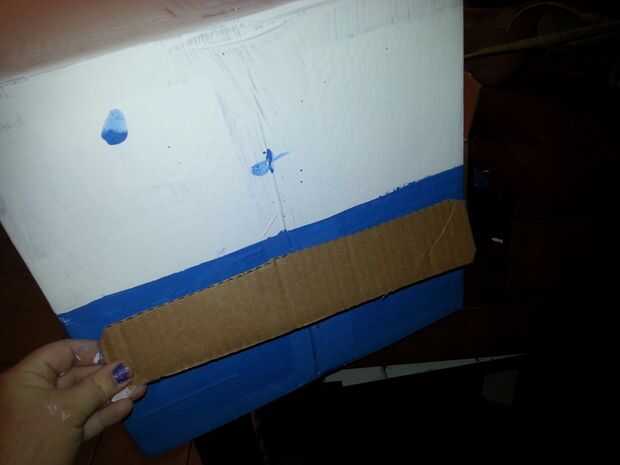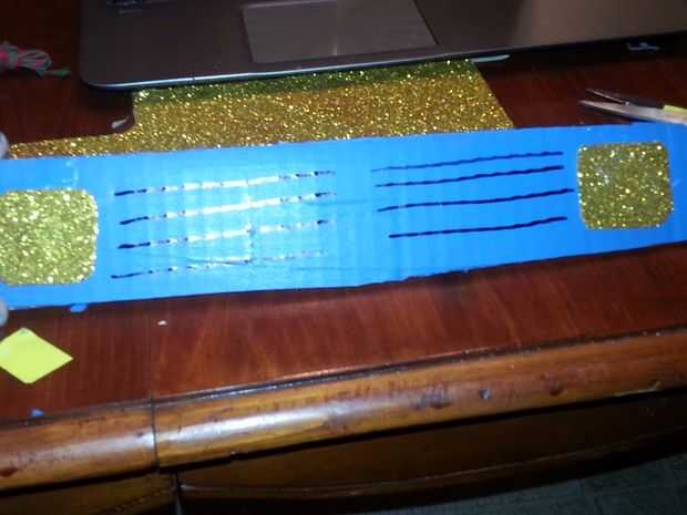 Pintura de esa pieza con pintura azul arte. Déjelo secar. Pegamento en dos cuadrados de oro brillo elaboración de espuma.