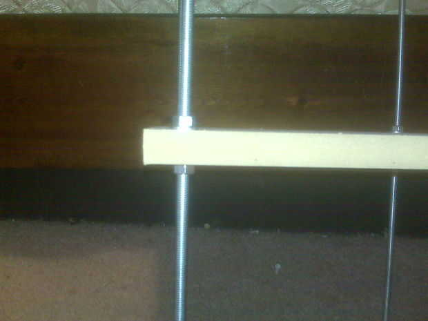 En un extremo de la varilla roscado, enroscar la tuerca de la bellota, deslice una arandela y una diapositiva en la parte superior nivel. La tuerca y la arandela mantiene la mirada final agradable y mantiene alguien se lastime si cae en él. en la parte inferior de la pieza superior, deslice una arandela, luego la tuerca. Una vez apretado le habrá la varilla asegurada al MDF. Acron tuerca -> lavadora -> MDF -> lavadora -> tuerca.