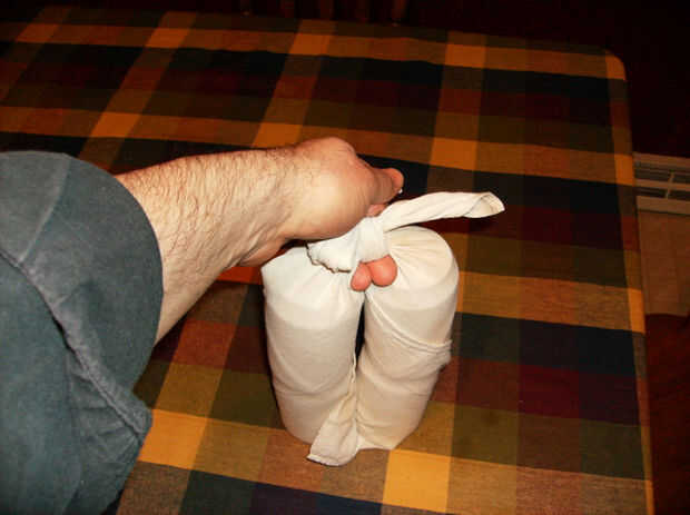 aquí es una manera rápida de llevar varias latas y botellas fácilmente mediante los métodos de Furoshiki con un paño cuadrado de aproximadamente 20 pulgadas a un lado.