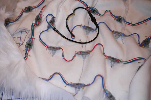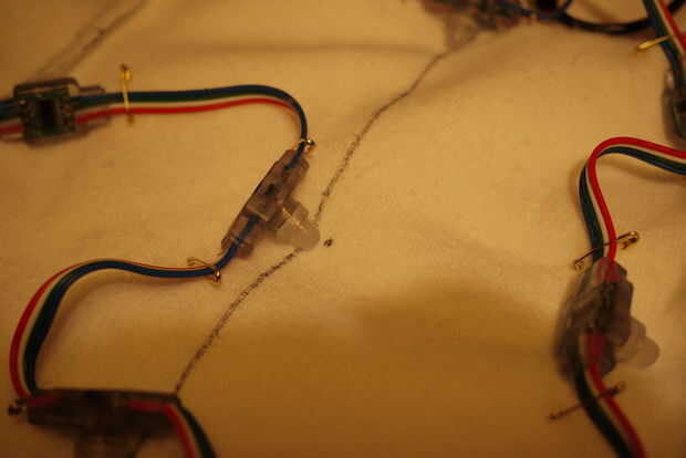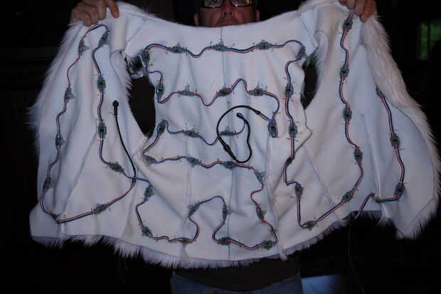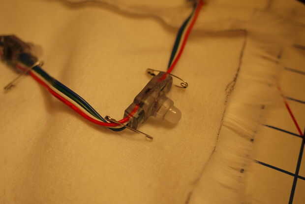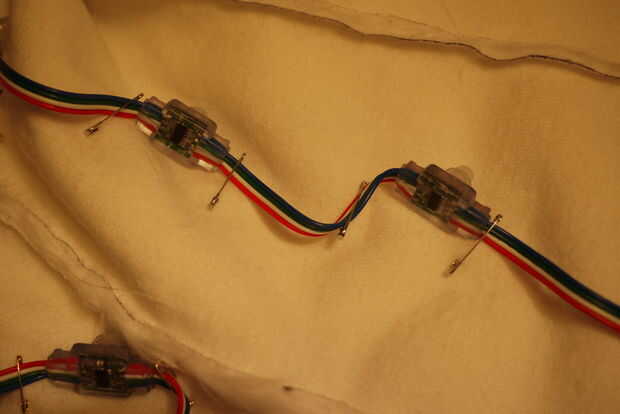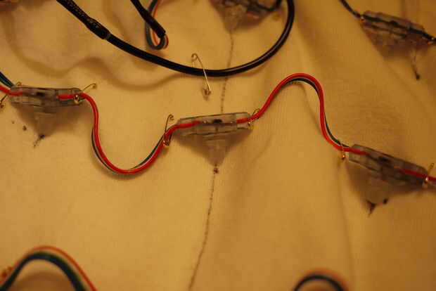 Una vez que la parte posterior cubrió a LEDs en, seguir adelante y fije los LEDs del panel frontal. El orden no es particularmente importante en los paneles frontales pero quiere organizar para obtener la mayor cobertura. Una vez más, lo importante es que el conector macho (el que está con los pernos visibles) colgando de su mano izquierda como llevas el chaleco.