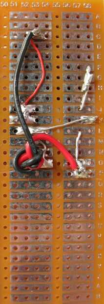 6. Introduzca el segundo plomo desde R1 (O54) hacia y alrededor del tercer conductor de R2 (L52) y luego hacia y alrededor de la principal base de Q1 (P58). La soldadura de ambas conexiones.