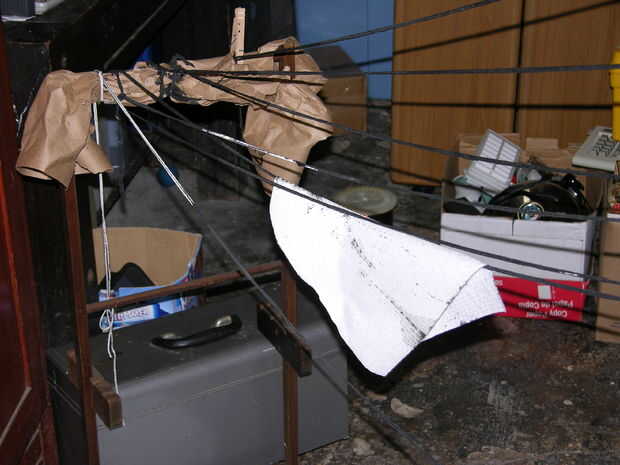 1. andando lentamente (con el fusor en tus manos) el post donde ligan la cadena (como veis en la foto puse una caja de herramientas en los pies del bandeja soporte para tv para dosent volcarse), en el otro post, asegurándose de que la cadena está totalmente cubierta con el lodo negro. También asegúrese de que las dos cadenas son pegadas cuando salga de lo tupperware, si no funcione con sus dedos sobre ellas tratar de presionar juntos otra vez. Si ellos no pegan entonces usted probablemente no añadía suficiente dextrina para su mezcla y usted debe revolver más en él.