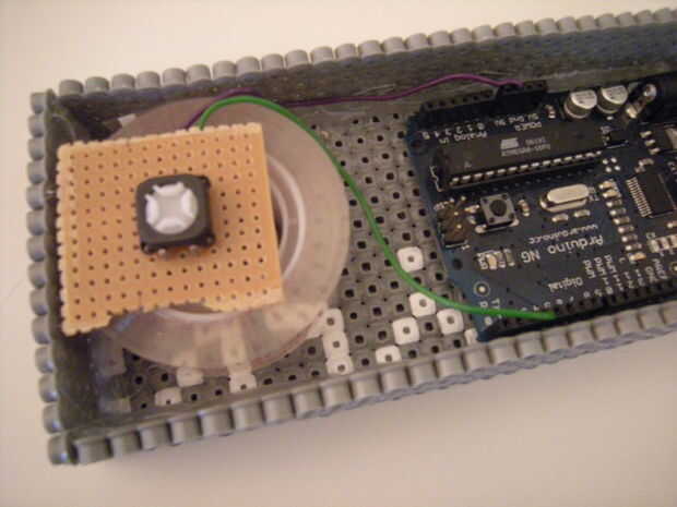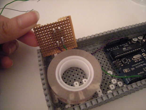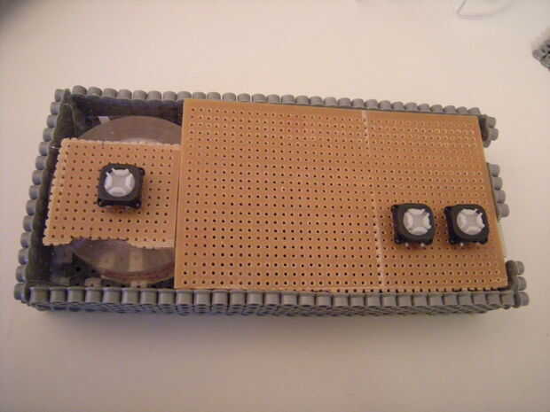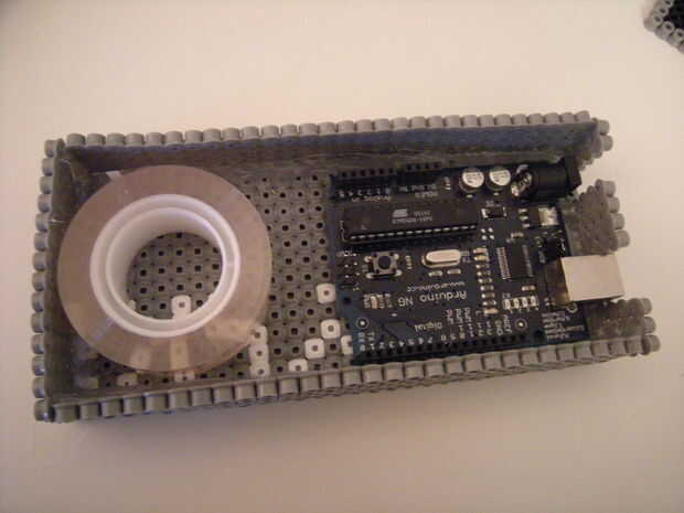 Coloqué un rollo de cinta adhesiva transparente junto a Arduino para permitir para que el panel frontal mantener la presión de los botones, como el cuerpo tiene una cierta profundidad para acomodar para el Arduino y la cubierta plástica es bastante frágil en comparación con madera, cartón u otros tipos de envases de plástico. Pero nada con el tamaño y robustez.