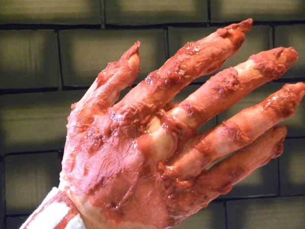 PRIMERO ENCONTRÉ UNA MANO PLÁSTICA BÁSICA EN EL ALMACÉN DEL DÓLAR, ENTONCES SALÍ DE ESCUELA PEGAMENTO MI FAVORITO MATERIALES-ELMER, PAPEL HIGIÉNICO (UNA HOJA), PINTAR PINCELES, SANGRE FALSA Y ALMIDÓN DE MAÍZ. TIENEN UNAS TIJERAS Y UN CEPILLO DE ESPONJA PRÁCTICO TAMBIÉN. CUBRIR LA MANO CON EL PEGAMENTO DE LA ESCUELA DE ELMER PRIMERO PUSO EL TP A CUBIERTA DE PEGAMENTO USO ESPONJA A PAT HACIA ABAJO. Añadir TP hasta que mano cubre, luego mezclar juntos falsa sangre y maicena para ESPESAR sangre (porción de 2 onzas taza 2/3 lleno de sangre falsa para sobre 1/4 de cucharadita de maicena) rasgar para arriba algunos TP en fragmentos de tamaño cuarto, uso falso sangre a DAB en el palillo TP a cepillo y palo sangre en la manos a, mantener, húmedo; CEPILLO DE LA SANGRE Y DOBLE O EMPUJE TP A PALO Y OBTENER LA TEXTURA DESEADA AÑADIR TP MÁS PROFUNDAS HERIDAS DIAPOSITIVA CEPILLO A LO LARGO DE LA BASE DE EMPUJE EN LA HERIDA, Y USANDO CEPILLO PUSH TP EN PILA ENTONCES EMPUJE DENTRO Y FUERA DEL CENTRO MANTENIENDO EL GOTEO DE CEPILLO CON SANGRE CONTINÚA HASTA TODAS LAS "LLAGAS" SE CREAN. AÑADIR ALGO DE SANGRE LÍQUIDA Y DEJAR GOTEO APENAS RECUERDA NADA ES PERFECTO Y SI NO TE GUSTA CÓMO RESULTÓ DESPÉGUELA, LAVADO, SECADO Y REPITA HASTA LLEGAR EXACTAMENTE LO QUE USTED QUIERE! DISFRUTAR DE