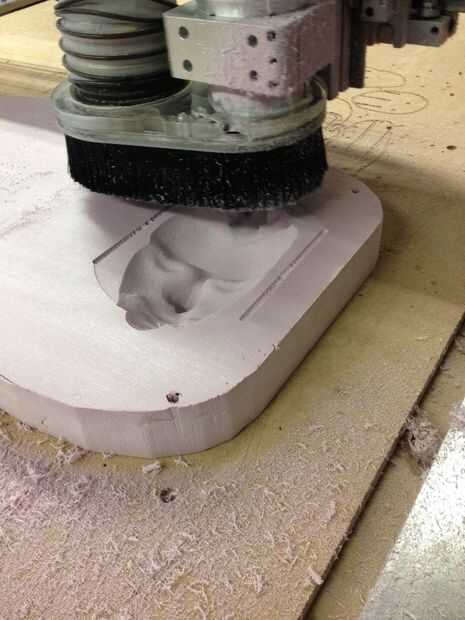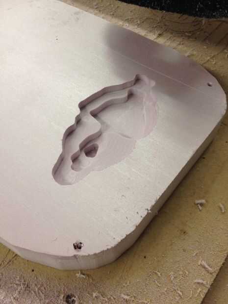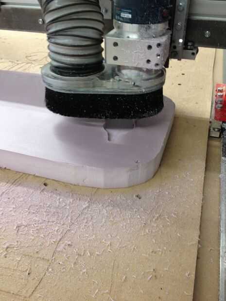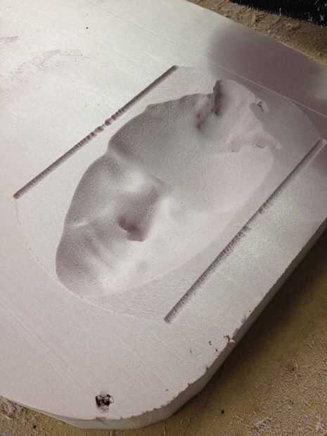 Comenzamos con 2" rosada espuma para nuestro patrón 1 y utiliza una mezcla de yeso/silicona para hacer un molde y generar nuestro modelo final para la caída. Hice un corte rápido, áspero en el ranurador del CNC con una punta plana 3/8", 2 flauta fresa en la espuma y luego pasó a un 1/4 final molino de bolas para una segunda pasada sacar algún detalle.