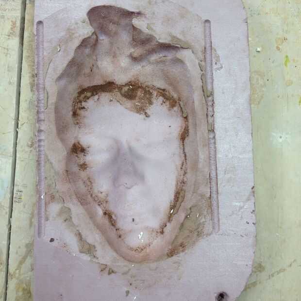 Para comenzar, presione una 1" losa de arcilla basada en agua en los detalles de la espuma rosa negativo que se muestra arriba. Llene el resto del molde con arcilla y dale la vuelta. Trabajo la cara arcilla y retocar los detalles o cambios con herramientas de arcilla. El estudiante aquí (Tori) no quería capturar su pelo por lo que fue cortada de la versión de arcilla antes de otros moldes. Establecer la cara positiva sólidos de la arcilla en una placa (boca arriba), que está varias pulgadas más grande en diámetro que la cara de arcilla. Asegúrese de que la Junta ya se resiste como un laminado o aplica uno como arcilla agua o vaselina. A continuación, construir una 3" de alto pared de arcilla aproximadamente 1-2" de la cara. Esto actuará como un muro de contención para que podamos verter la mezcla de yeso/silicona directamente sobre el rostro y contener la mezcla de líquido alrededor de él. No necesitamos un comunicado para la arcilla, pero sólo asegúrese de que la Junta tiene uno.