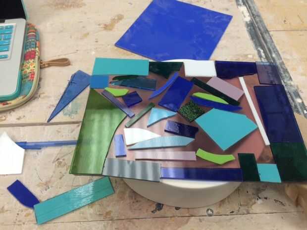 Para empezar, tenemos que decidir las dimensiones de la pieza acabada. En la escuela, tenemos varias cajas de diferentes formas, tamaños y colores de cristal. Las fotos de arriba muestran toros trabajando en un diseño que consiste en muchos fragmentos y piezas destrozadas de cristal en una hoja más grande. Una vez finalizado el diseño puso la pieza sobre la bandeja preparada y ajustar el horno.