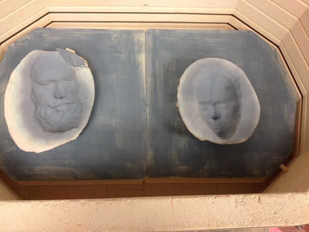 Decidimos crear un segundo conjunto de moldes que estaban en el positivo. Así que en lugar del molde como alguien empujó su cara en él, los moldes como las caras de los estudiantes fueron empujando fuera de la bandeja de horno. La Copa recién desplomó se cernía sobre los moldes de ladrillos de fuego fuego preparado. Esto permitió que el molde a bajar lentamente uniformemente sobre la cara. Además de golpes encima de la temperatura y el tiempo, tuve que llegar con una barra de metal para empujar los firebricks fuera del camino para que el vidrio podría cubrir totalmente el molde. El vidrio no es muy maleable pero lo suficiente para bajar lentamente; es similar al acrílico en 300-400F.