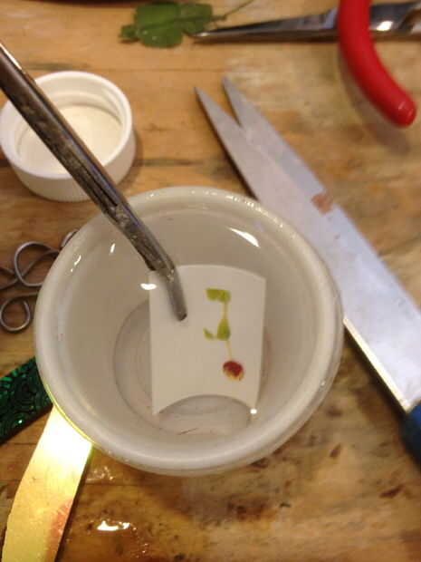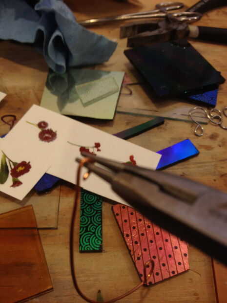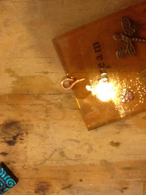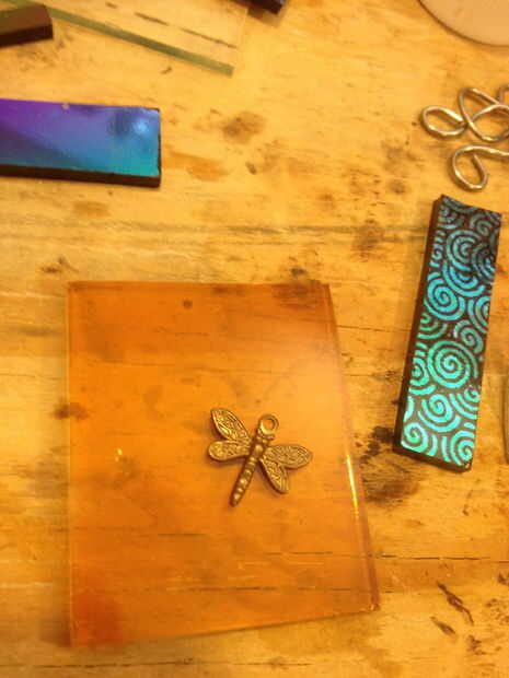 Lugar la libélula de latón sobre la pieza de fondo de vidrio, así como el alambre para hacer la bala, asegurándose de que un bucle se extiende más allá del borde del vidrio sean accesibles para un anillo del salto.