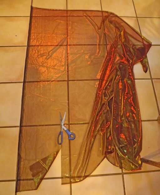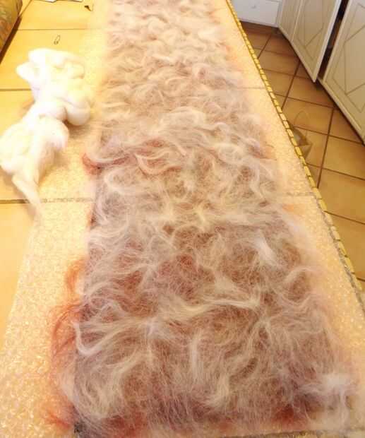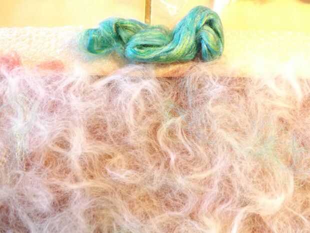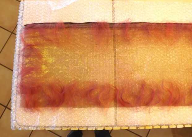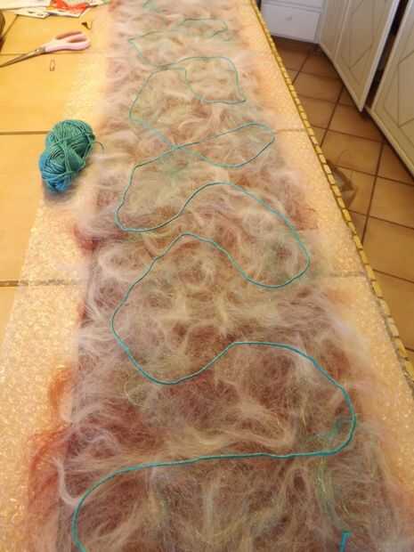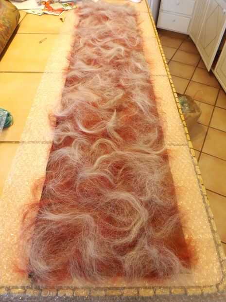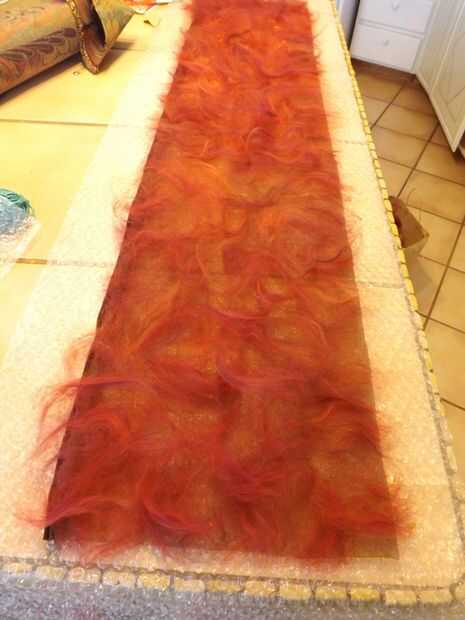 Extender varias capas de fibras naturales en la malla alternando las direcciones. Para este abrigo de fieltro puse dos capas de lana de merino rojo abigarrado; dos capas de lana merino gris y blanca; fibras de bambú con unos verdes y amarillos y colocan aquí y allá; y una longitud de hilo de seda verde azulado colocado sobre las otras fibras. Para asegurar el hilado de seda, he añadido una capa casi imperceptible de lana merino blanca encima de ella.