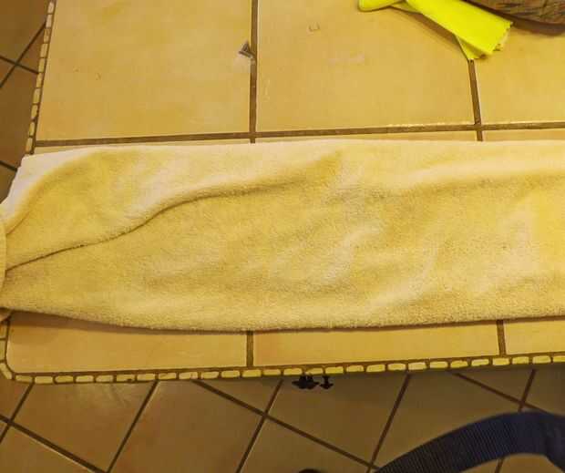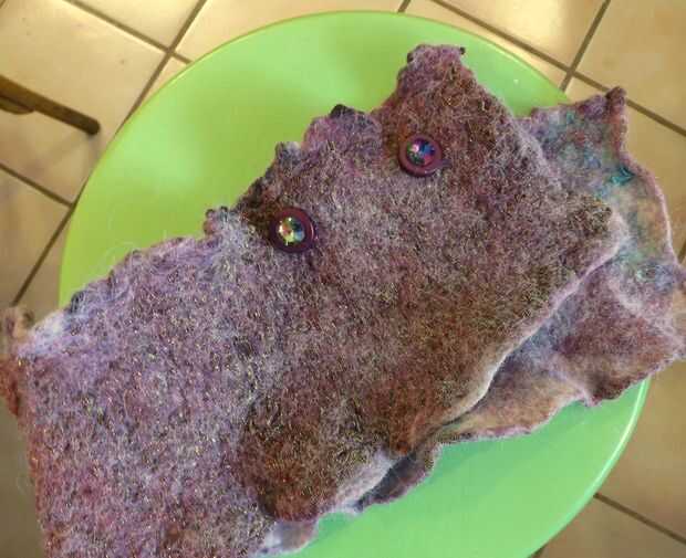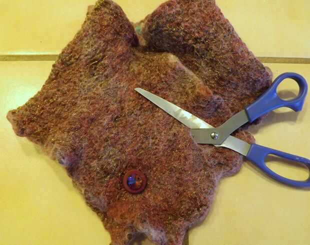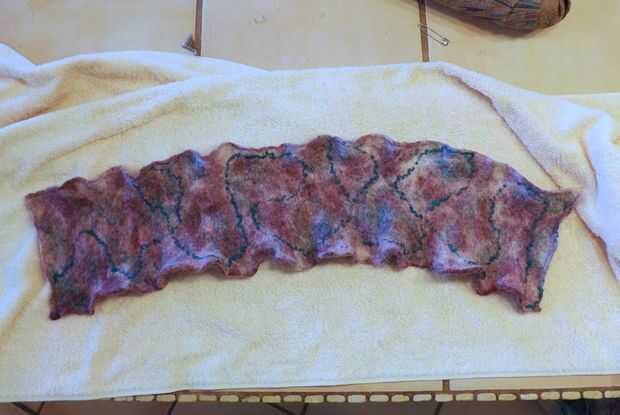 Deje que se seque completamente durante la noche. Si este fuera un proyecto plano (como mi otra bufanda de fieltro), sería acelerar el proceso de secado con un hierro caliente. Pero no quería estropear los bordes estriados, así que no hay hierro en este proyecto.