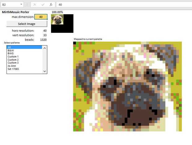 Este proyecto utiliza un programa que escribí que le permite asignar cualquier imagen a cualquier paleta de grano de fusible, para que pueda tomar imágenes de mosaico realista de los granos de hierro para derretir tan popular con los niños de preprimaria. Se ejecuta en Excel 2016 (que necesitarás para su uso), aunque es posible que funcione en versiones anteriores, no lo he probado. Otros han escrito programas similares para iOS, Windows, etc., pero como se verá, Excel tiene ciertas ventajas.