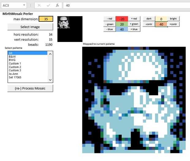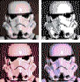 Para mejor ajuste de la paleta disponible de granos (y hacer algunas fotos de la cool!), usted puede ajustar la imagen de la fuente con los botones para los niveles de rojo/verde/azul, brillo y contraste. Recomiendo trastear con estos ajustes, ya que pueden hacer una aburrida imagen interesante y una paleta pobre partido en una hermosa. En el ejemplo aquí de Storm Trooper, yo he reducido el rojo y aumentó el azul, así como aumentó el contraste. Aparece mucho más estilizada esta manera, más como un personaje de videojuegos de 16 bits que una foto.