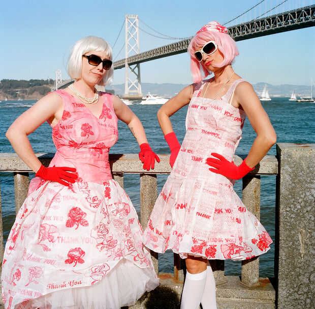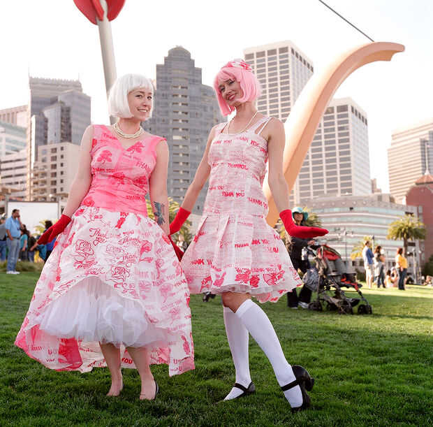 Los vestidos gracias son segunda vida la manera de volver a fabricar bolsas de plástico, fusionando juntos para crear un nuevo tejido. Inspirado en clásicos vogue, un vestido es 1920 y el otro es 1950′s. gracias por reciclar!