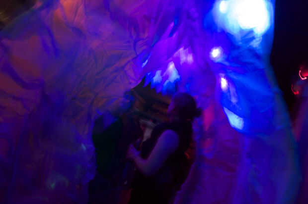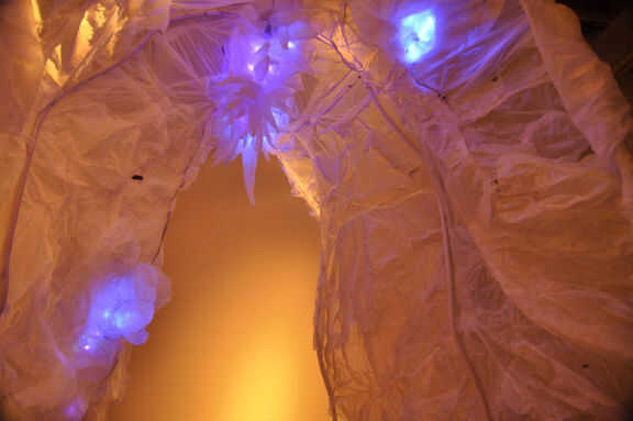La Respiración de la pared es una instalación interactiva. Inspirado en anémonas de mar y pez, responde a la proximidad del movimiento humano con bio.luminescent luz de la pantalla y la piel inflable. Hecho de materiales reciclados; bolsas de plástico de un solo uso se fusionan para crear tela inflable con texturas orgánicas. Luego, sensores de movimiento conectados a ventiladores de ordenador CPU responden al movimiento y comienzan a inflar a la tela. De esta manera, cada interacción promueve un diálogo arquitectónico. La instalación de la respiración de la pared ilumina la evolución actual de los plásticos en el medio acuático. En las islas grandes de plástico, plástico suspendido imita y realmente se convierte en la nueva vida de mar.
