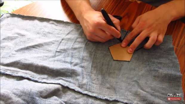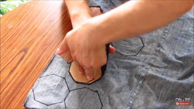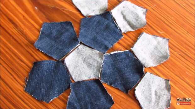De cartón, hacer dos plantillas. Una forma de Pentágono y un hexágono. un poco más grandes. Tome un pedazo de tela, jeans viejos funcionan realmente bien y dibujar alrededor de ellas con rotulador. Necesitarás algunos de formas de Pentágono, y hasta tres veces tantos hexágono. Recorto.