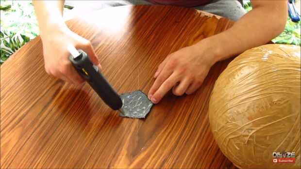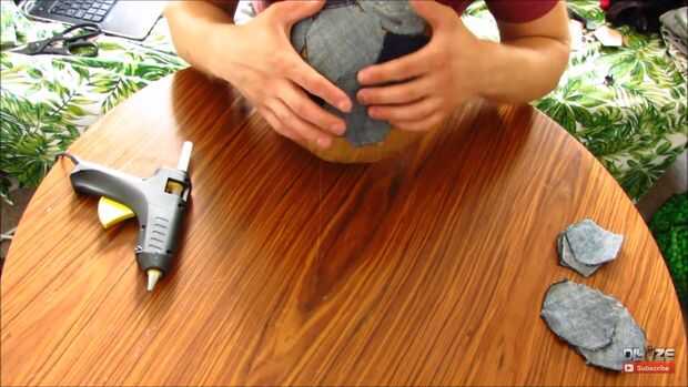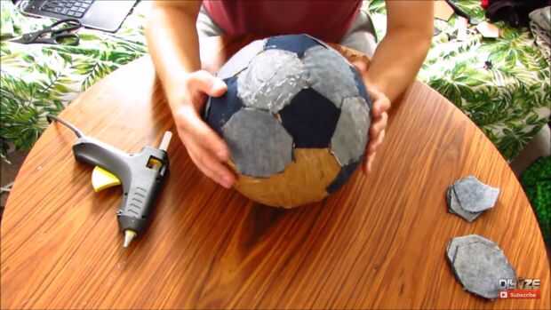 Pegar como se muestra en fotos, os recomiendo que para ver el video al principio. Pegamento caliente funciona bien, pero usted puede utilizar algo más fuerte. su forma alrededor de la bola y cuando llega al punto donde hay espacios para llenar en corte solo un trozo de tela de la forma de trabajo y pegar allí.
