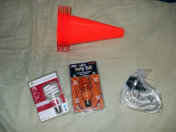 La parte primera y más difícil, era rastrear conos adecuados. Conos de tráfico regular "prestadas" de todo sería demasiado gruesos para que de luz a través de. Traté de articulos para deporte de Dick, Target y Walmart en busca de conos de práctica fútbol pero sólo pude encontrar los discos planos y conos con corte en los espirales. Ninguna de estas trabajar así que partí en búsqueda en línea. Encontré un conjunto de 12 conos de 9" en Amazon.com para menores de 20 $ con el envío libre, así que hice mi pedido y conjunto sobre la compra de otro necesita partes. Un viaje a The home depot me pescó una bombilla fluorescente de 75 Watts y algunos zipties. Compré un bulbo fluorescente porque no conseguiría lo suficientemente caliente como para derretir los conos una vez que la lámpara fue construida. También probé una bombilla fluorescente naranja, pero los resultados no fueron tan espectaculares, por lo que el blanco se utiliza.