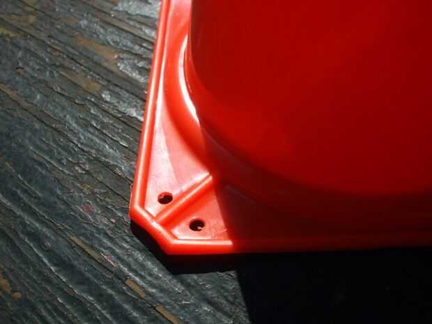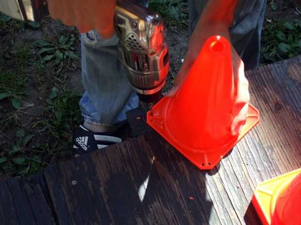 Perforé 2 orificios en la esquina de cada cono. El plástico era muy maleable y pude haber probablemente utilicé un objeto punzante para hacer el trabajo. Pero tuve mi taladro, así que ¿por qué no usarlo?