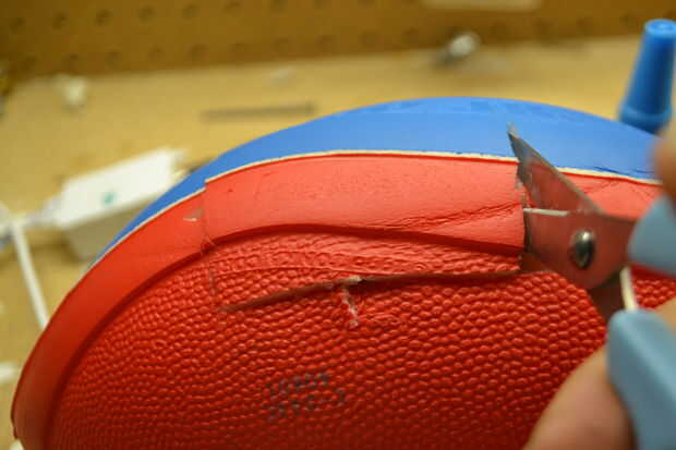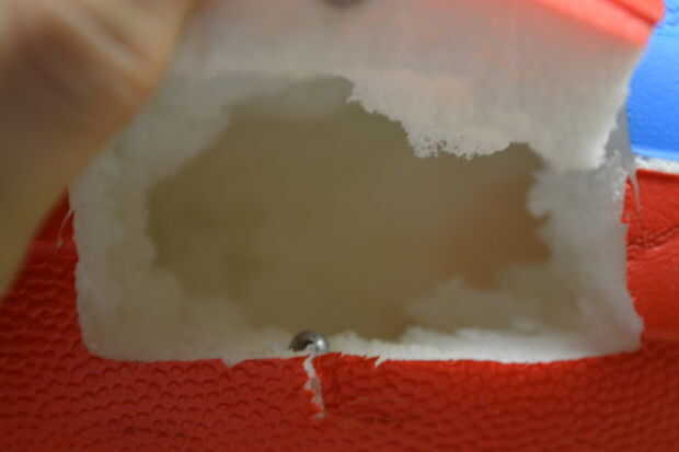 cortar un agujero en el fútbol lo suficientemente grande para la batería, el conector y el receptor, pero asegúrese de dejar un colgajo.