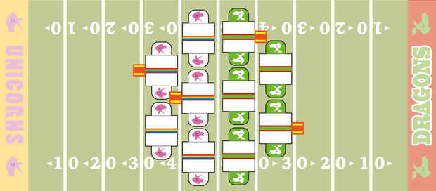 Cada jugador humano se permite a cinco jugadores de papel en la cancha, dos de los cuales deben contener Fizzbits (estos son los Fizzbots). Quien gano el sorteo comienza con posesión en su yarda 30 linea propia. Tienen tres oportunidades para avanzar la bola 10 yardas. Ambos jugadores humanos deben alinear sus jugadores en dos líneas, con tres en el frente y dos detrás (como en el diagrama). Donde las Fizzbots es colocados dentro de esta formación depende de cada jugador. Antes de que comience el juego ambos jugadores humanos deben sostener sus Fizzbots en su posición.