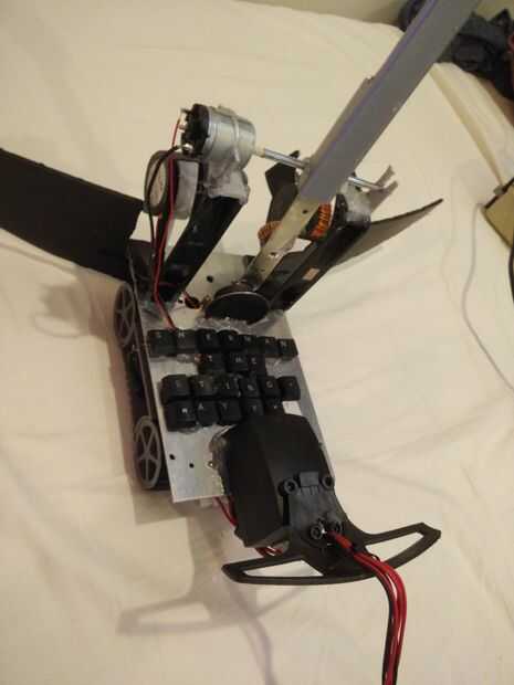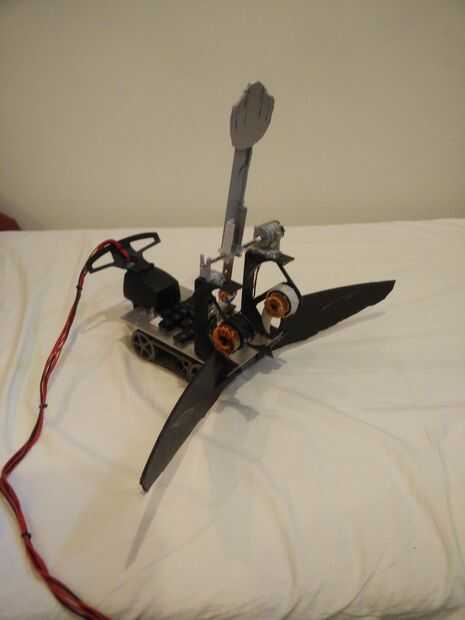La base de este vehículo es algo de pista de Caterpillar que se encontró en el montón. Las pistas son accionadas por dos motores de corriente continua y algunos engranajes.