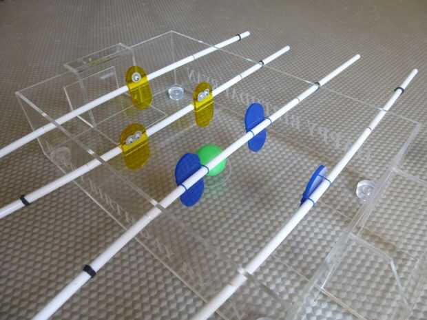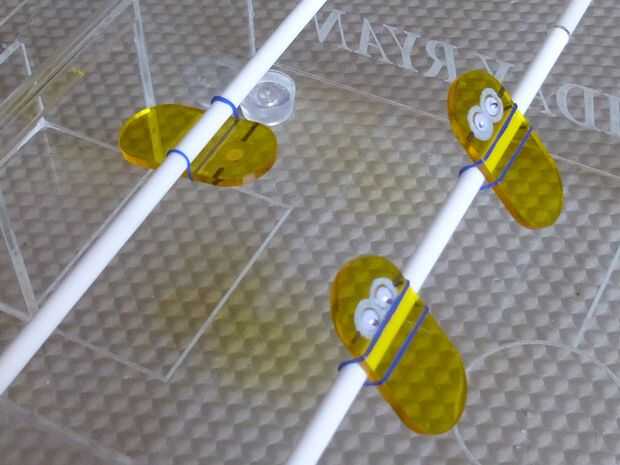 He utilizado bandas elásticas para garantizar a los jugadores a las barras y también para crear defensas y puños en los extremos. Permitiendo a los jugadores a ser atado y quitado fácilmente permitió que cada niño personalizar y llevar a casa un jugador después de la fiesta.
