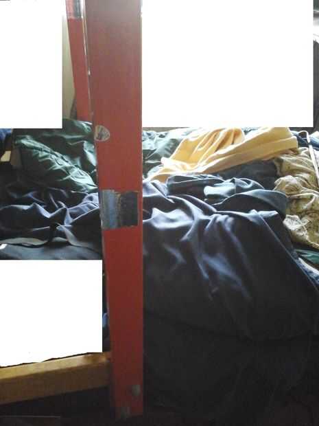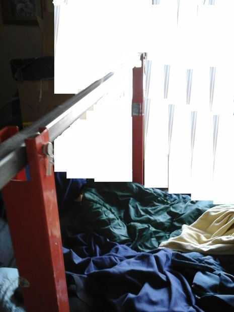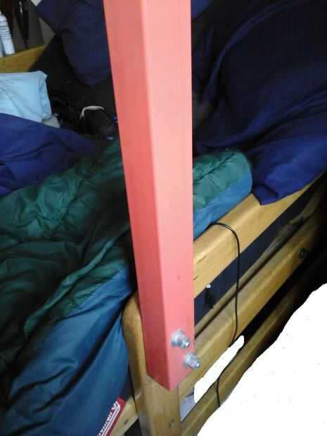 Una vez que cada polo está claramente marcada, tome cada uno y tomar que sobre la cama hold it contra el marco de madera de roble para asegurarse de que tiene el mismo aspecto para cada lado con el primer agujero cerca de la parte inferior y ¼" desde el borde más cercano a la cabecera de la cama.