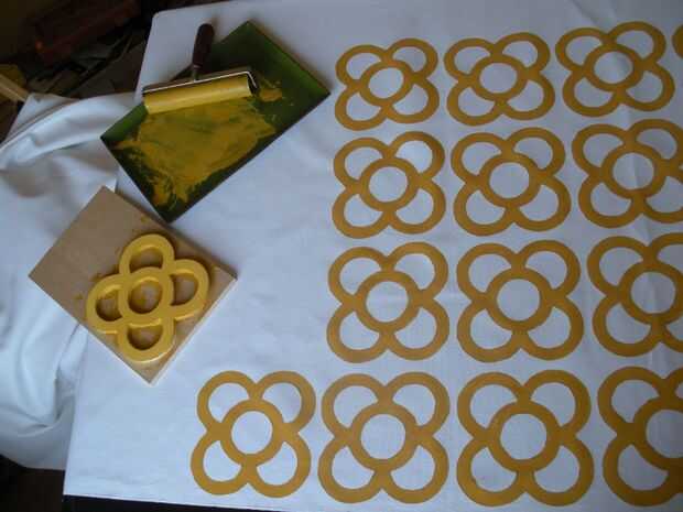 Luego pasé horas... literalmente horas... sellado el patrón sobre el lienzo de trabajo pesado con la pintura de tela. Lo hice en dos etapas, como tiene que secar por 24 horas y a 5 yardas de tela toma mucho espacio! Después de la tela se haya secado, calor conjunto la pintura de tela con una plancha, va en todas las zonas pintadas durante 5 minutos con un hierro caliente caliente.