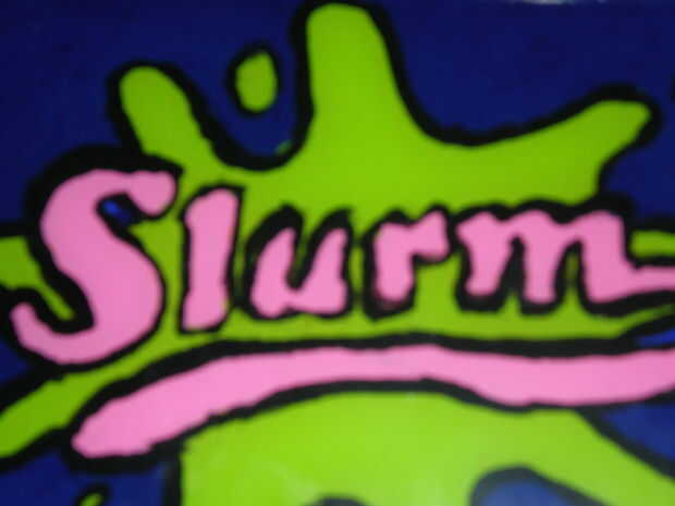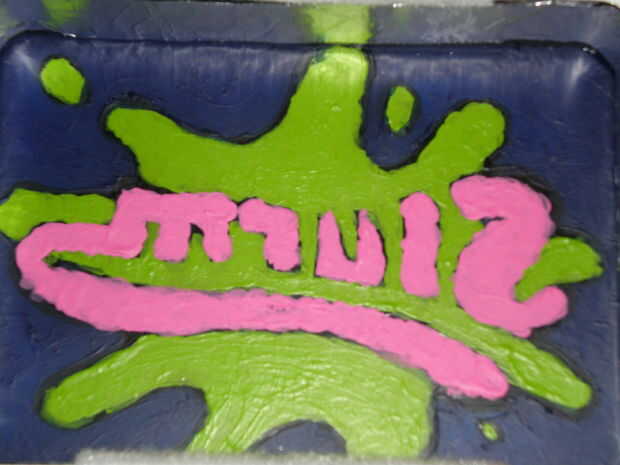3. utilizar el logotipo como una herramienta de trazado a mano de pintura de la insignia sobre la pintura. Pinté el contorno negro del logotipo en primer lugar, seguido de la baba verde, fondo azul y letras color rosa.