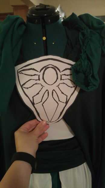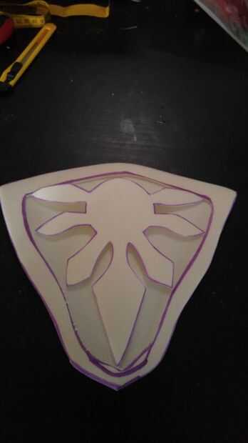 Para adorno de pecho de Fuu dibujé el patrón de salida (usted podría crear un vector o incluso imprimir una versión saltar si el dibujo no es su fuerte) entonces trazada en una pieza de arte espuma de 1/4". Entonces usé cemento de contacto para unir las piezas de espuma (Nota: Use guantes y un respirador cuando trabaje con el cemento de contacto - que es tóxico). Una vez que la espuma se pega yo corte dos pedazos de worbla que fueron un poco más grande que la pieza de pecho y usa una pistola de calor para calentar el material termoplástico. Con el plástico listo me puso sobre la espuma y presiona las dos piezas juntas.