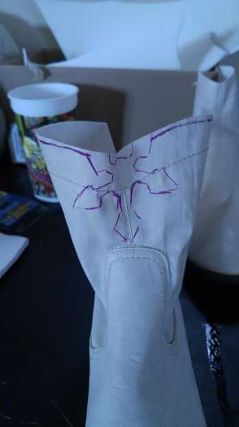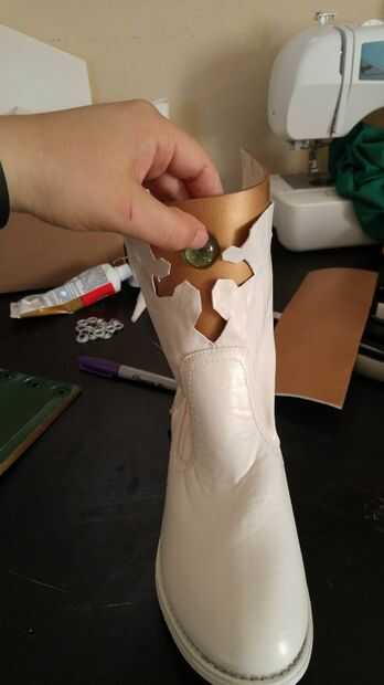 Fuu tiene algunos detalles de oro de sus botas. Intentado encontrar a tela de oro, pero quedó corto. Trabajar con lo que tenía un exceso de (espuma) corté la forma del detalle, aerosol pintado oro espuma, agrega una joya entonces caliente pega la espuma en el interior del zapato. NOTA: ESTO FUE TEMPORAL. Posteriormente usé cinta gruesa para sustituir la espuma.