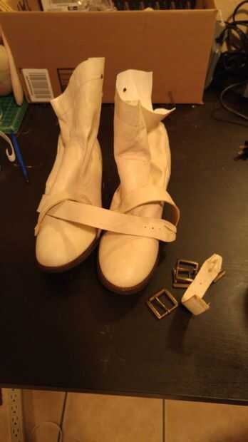Tapas de arranque son todavía un área que lucho con así que cogí un par de zapatos usados de mis descuentos locales y quitar todas las correas/hebillas en ellos. Usé pintura en spray Rustoleum para mejorar el blanco de las botas, luego selladas la pintura con un mate de capa de aerosol de Mod Podge (esto ayudó a la pintura del roce mientras caminaba).