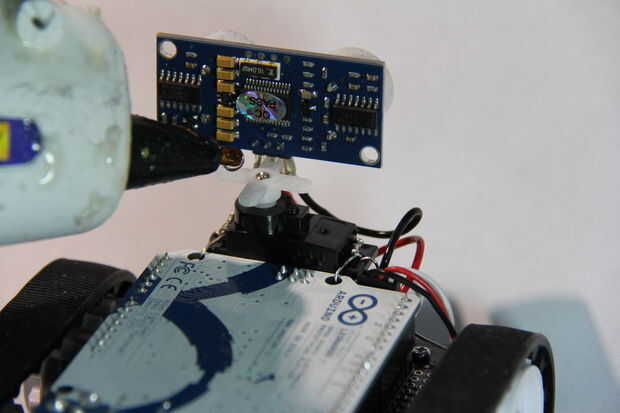 - La soldadura de los pines del sensor Ping: 5V a 5V, GND a GND, SIG a D4. Estos pernos deben ser justo por debajo de los pernos de servo.