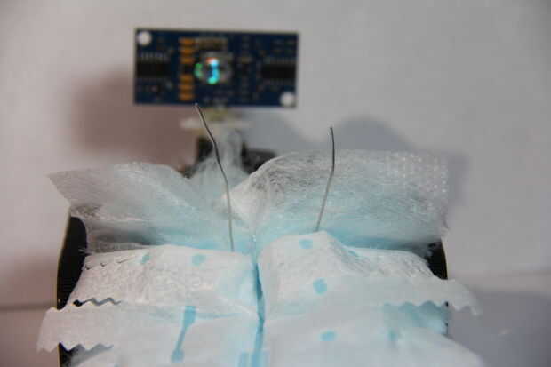 - Recalentar la soldadura y soldar cada cable a un pin del sensor Ping.