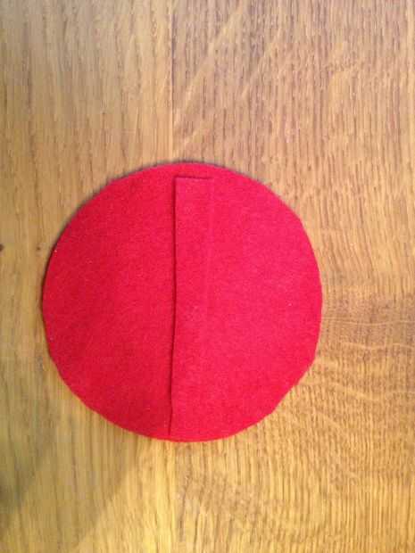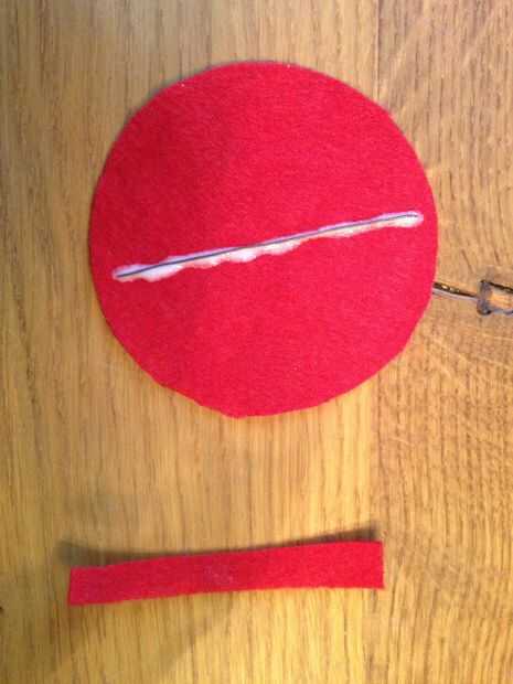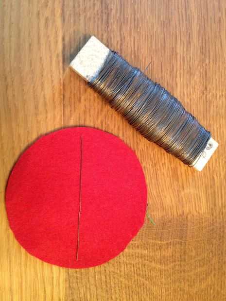 1. cortar un círculo de 4 1/2 pulgadas de diámetro de una pieza de fieltro. Cortar un trozo de cinta que empareja un poco más corto de 4 1/2 pulgadas. Con cortadores de alambre, corte un pedazo de alambre floral ligeramente más corto que la longitud
