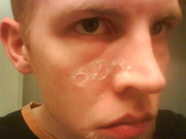 Ahora, si su seco. Suavemente tratar de conseguir un apretón en el pegamento pellizcando la piel y tire hacia arriba de la piel, pero no tire de ella de todo. Que tendrás que arrebato el pegamento y el rodillo los bordes para conseguir este look. Parece una ampolla explotó o tal vez alguien derramó unas gotas de ácido en la cara...