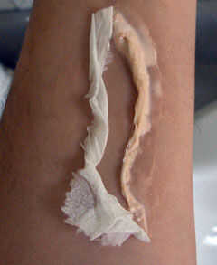 Después de la capa base de látex líquido ha empezado a secar, quitar un cuadrado de papel higiénico de un rollo. Tratar de obtener un tipo de dos capas sin textura ni diseño. Separar las capas y cada lado del rodillo en una serpiente como la estructura. Esto creará la piel levantada que forma la herida. Tomar uno de los rodillos y aplicar a la base de látex.