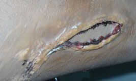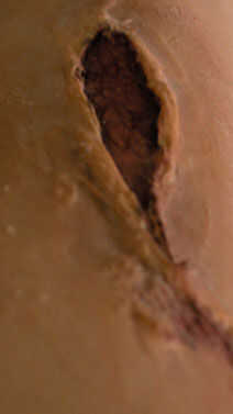 Ahora que las heridas ha sido mezclado en el área de aplicación, es tiempo para empezar a trabajar en el interior de la herida. Comenzar aplicando algo de maquillaje más oscuro en los bordes interiores de la herida para simular la sombra más fuerte y añadir profundidad. En este ejemplo he usado negro.