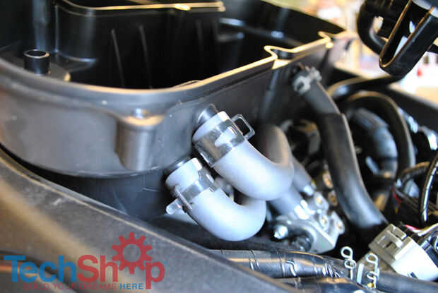 Permite a las Naciones Unidas las mangueras de la abrazadera en la parte trasera de la airbox. Usé un par de alicates de punta para esta tarea. Tome nota de la orientación de las mangueras. La manguera en el lado izquierdo del airbox es el AIS. Después de habrán desconectado todas las mangueras, puede ahora completamente quitar el airbox de la moto.