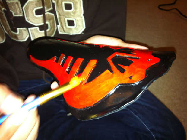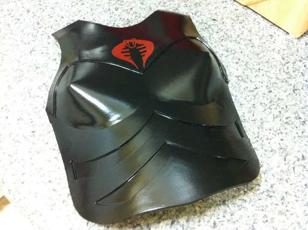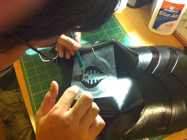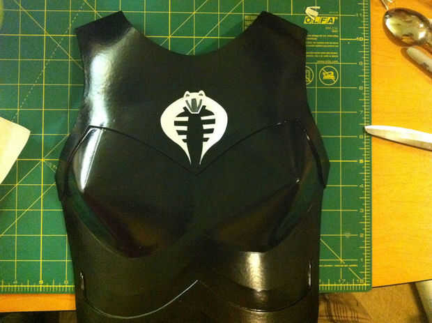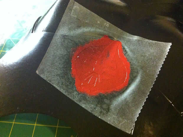 Para los detalles en rojo, dibujó un logo Cobra en la placa del pecho. Una vez que había esbozado con lápiz, luego tomó un marcador Sharpie para hacer más visible para cortar la plantilla. Corte el logo Cobra para asegurarse de que las proporciones eran buenas. Ahora se que todo lo que es en el para arriba y para arriba, tengo cortado el logo del material de la plantilla (papel de contacto) y colocar sobre la pieza de cuerpo donde quiero ir. Mezcla alguna pintura acrílica, con un poco de negro, llevar un borrador mágico esponja y frote sobre la plantilla. Espere 30 minutos para asegurarse de que esté seco al tacto y luego retire la plantilla. Para las piezas del brazo, había cepillado en la pintura y deje secar. Una vez que estoy satisfecho con el trabajo de pintura y color de acento, claro había revestido exterior de las piezas. Para las piezas como la espalda y las piernas, yo claro había revestido después de la etapa de pintura en aerosol.