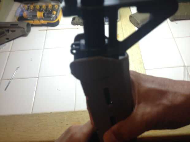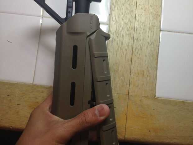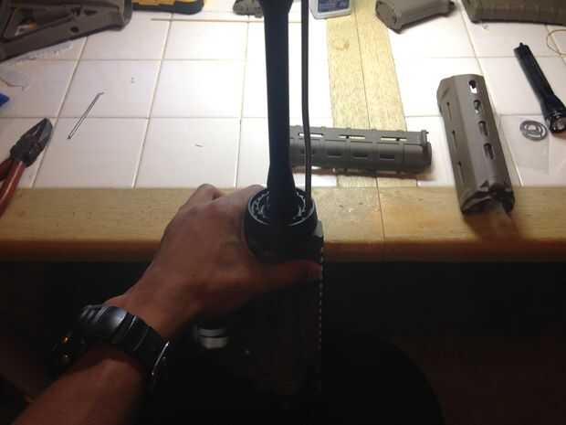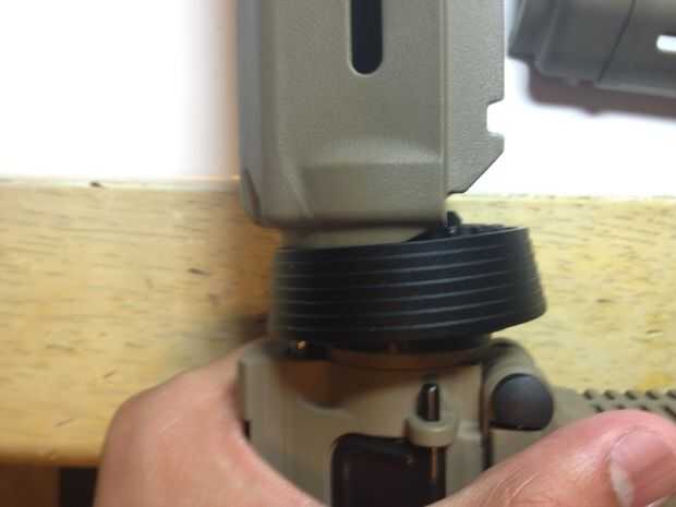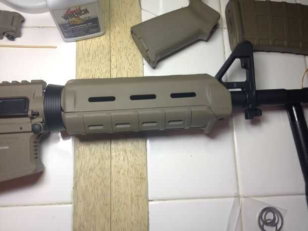 Coloque el saliente del semicírculo en la parte delantera de la mitad superior de la chapa en el tapón del guardamanos. Tire hacia abajo el anillo de delta con una mano y presione la parte posterior de la mitad de la chapa en el anillo de delta.