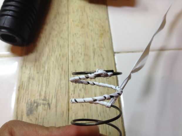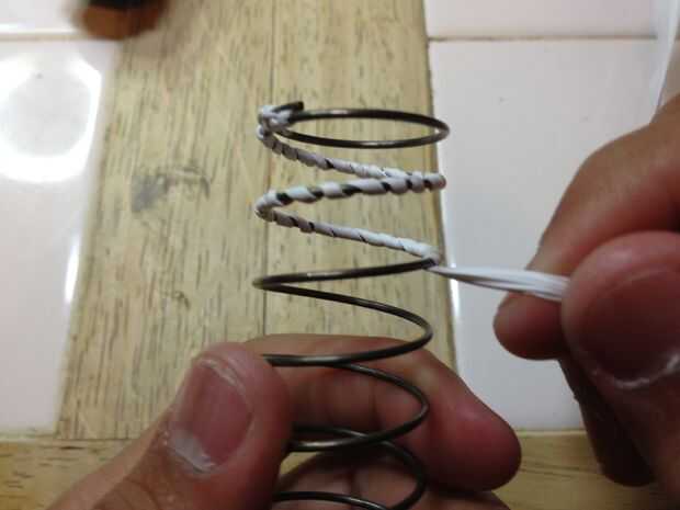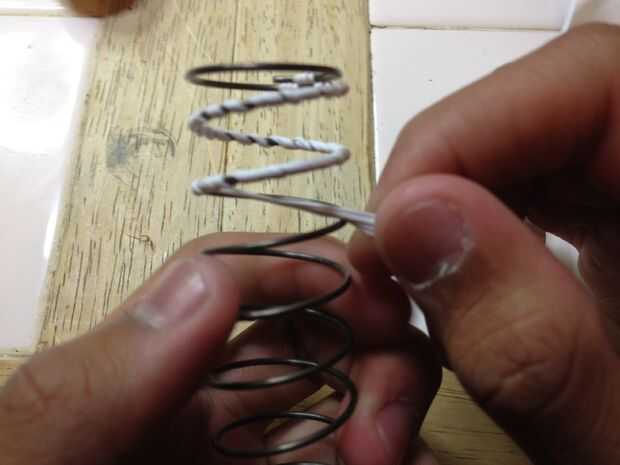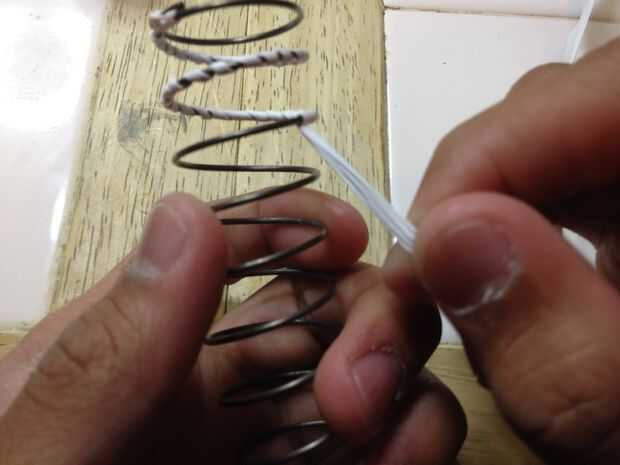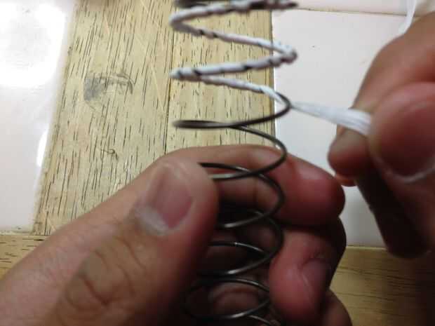 Atar el extremo de a un extremo del resorte y envolver el resto de la misma como se muestra en las fotos. Encontré que la mejor manera de envolver es rotar la primavera y mover la cinta alrededor de la sección de primavera que envuelve. No te preocupes si es torcido, pero no trate de envolver más de una capa en cualquier sección dada del resorte. Si usted puede conseguir mantenerse recta, puede cubrir más superficie con menos cinta.