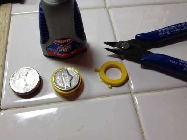 Para evitar esto, puede colocar a espaciadores dentro del tubo del almacenador intermediario antes de poner en el resorte y el amortiguador para que el perno de búfer no se deslice lo más atrás en el tubo de solución tampón. La gente suele utiliza varios cuartos, pero usé dos arandelas de la manguera de goma y un cuarto (la cuarta parte es necesaria para que el búfer de contactos realmente algo). Puede que necesite recortar algunas extra de goma de los lados de las arandelas de la manguera si los utilizas. No utilice un níquel como en la foto, ya es un poco demasiado pequeña.