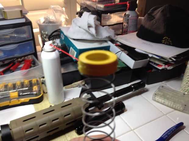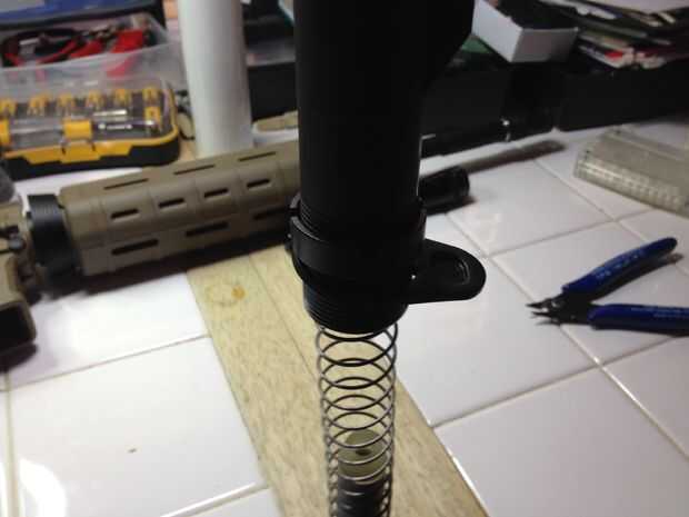 Editar (08 de octubre de 2013)-he encontrado una manera para eliminar el ruido en el tubo de búfer causado por el buffer spring delatar alrededor. Sólo necesitas un poco de cinta de teflón, esa cinta blanca fina 1/2 cm de ancho se usa para sellar las roscas de las conexiones de tubería. Yo no recomendaría algo más grueso, ya que puede impedir el movimiento de la primavera de amortiguación o causar que se atascan.